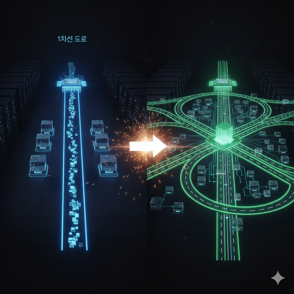CPU(중앙처리장치)와 여러 D램(메모리)을 '1차선 도로'로 연결하는 것과 같습니다.